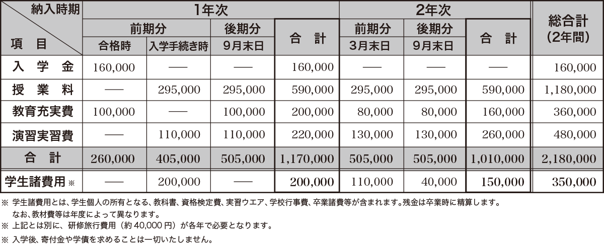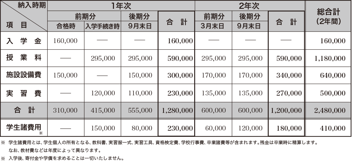 ※家族の適用範囲は、本人を基準に第2親等以内とします。双子で入学の場合は、それぞれの学科の学生諸費用を減免します。